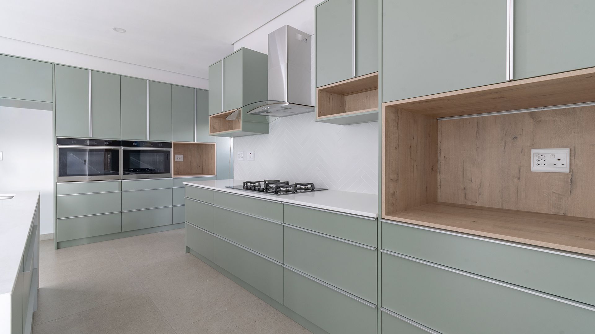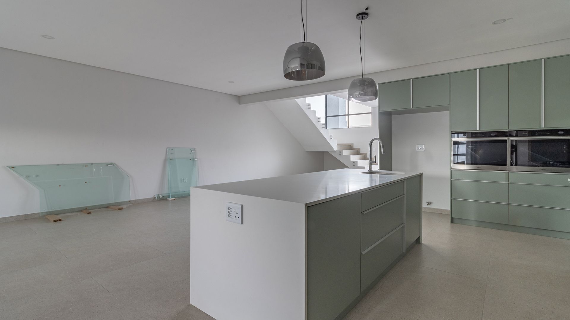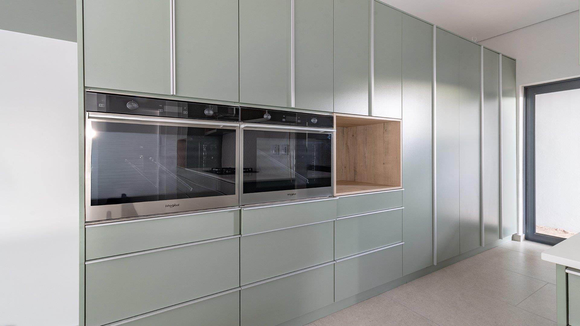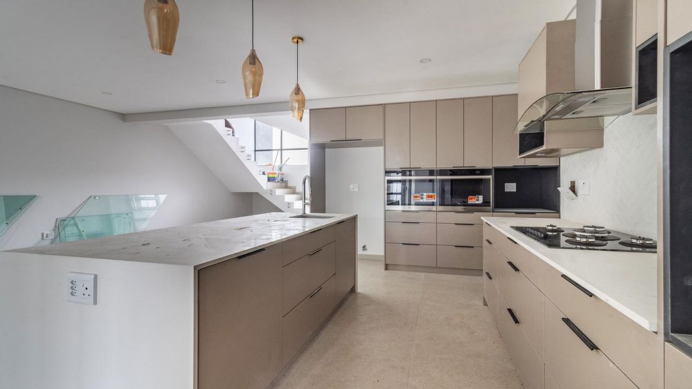 Downstairs, the home opens into a seamless open-plan lounge, dining area, and kitchen, perfect for modern living and entertaining. The stylish kitchen is equipped with two eye-level ovens, a gas stove on the central island, and a dedicated laundry area with plug-in points for a washing machine, dishwasher, and tumble dryer.