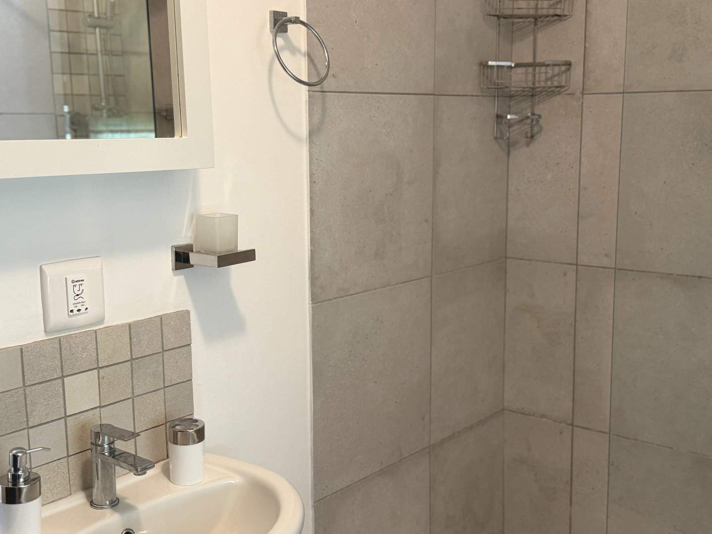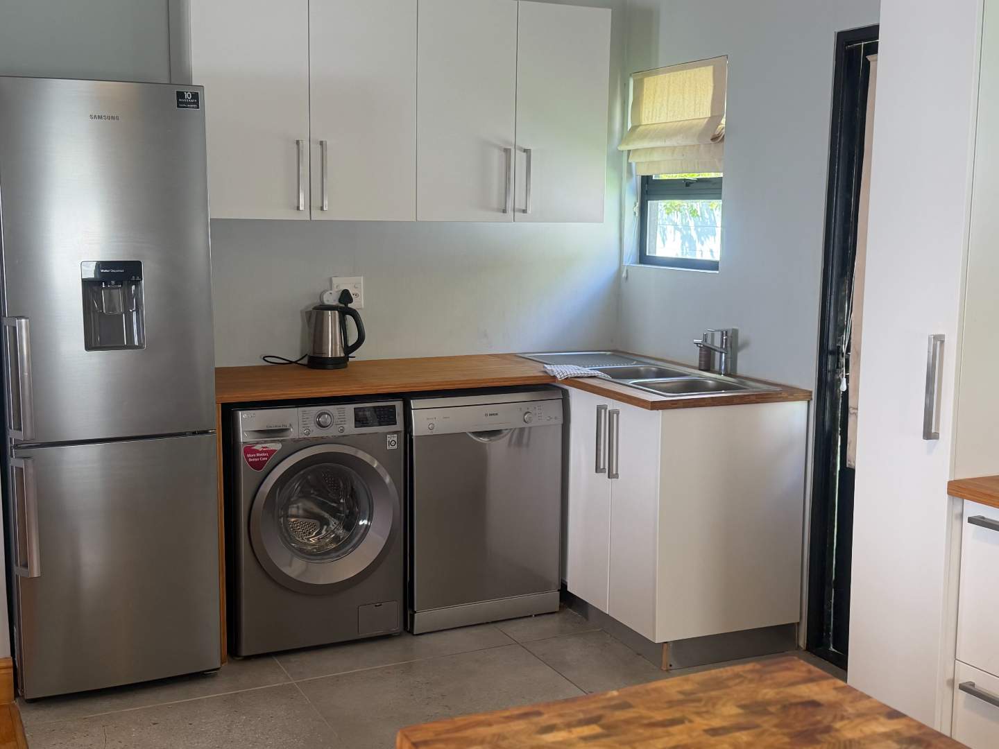 Kitchen plumbed for 2 appliances gas hop and electrical oven kitchen door leading out to the garden with synthetic grass.
