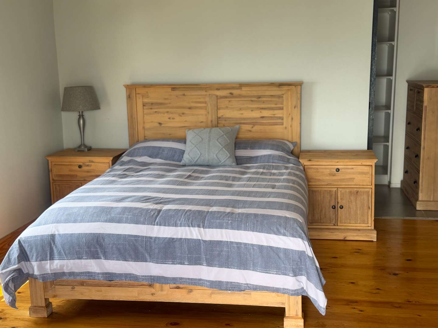 Large main bedroom with walk in closet with ensuite bathroom with both shower and bath. Doors leading out to a balcony that is the length of the house