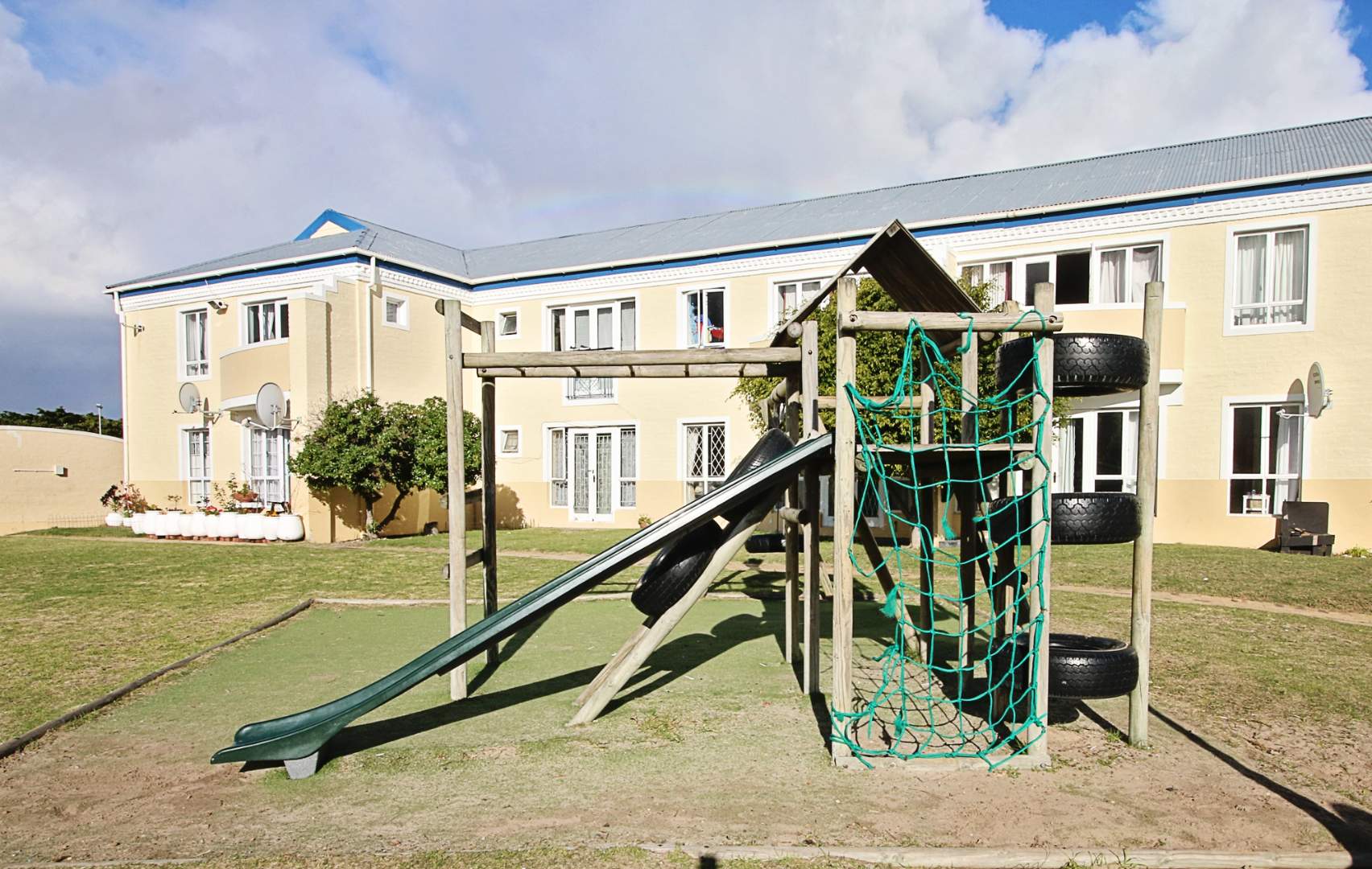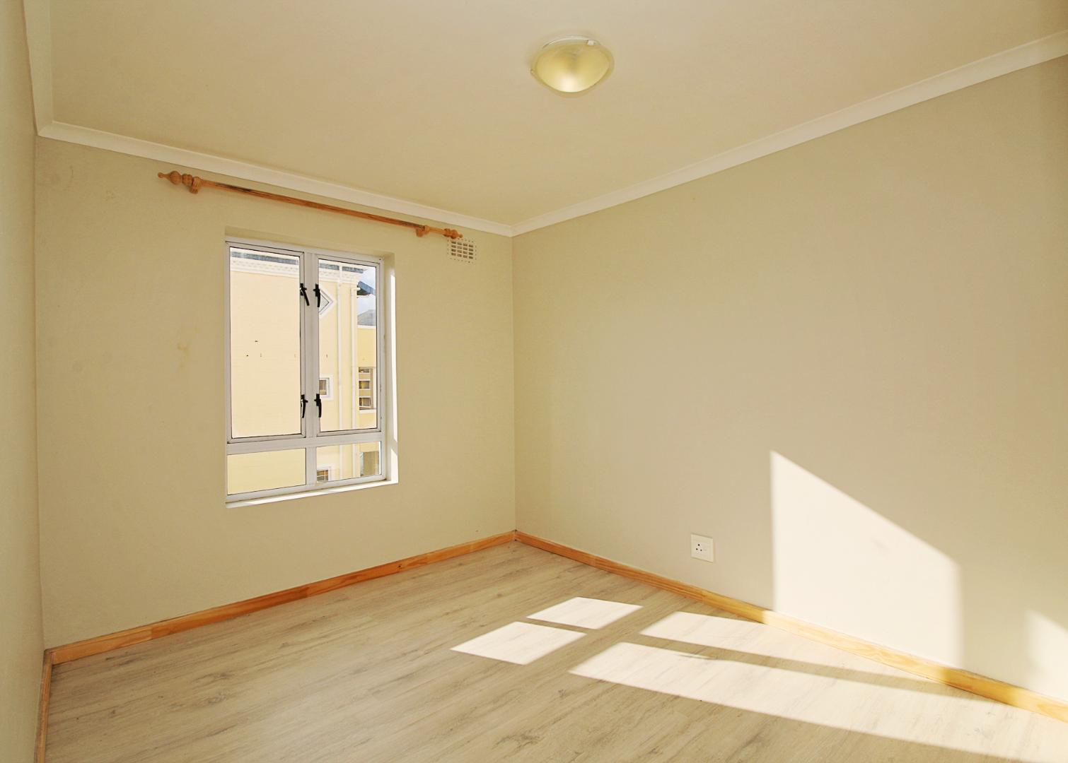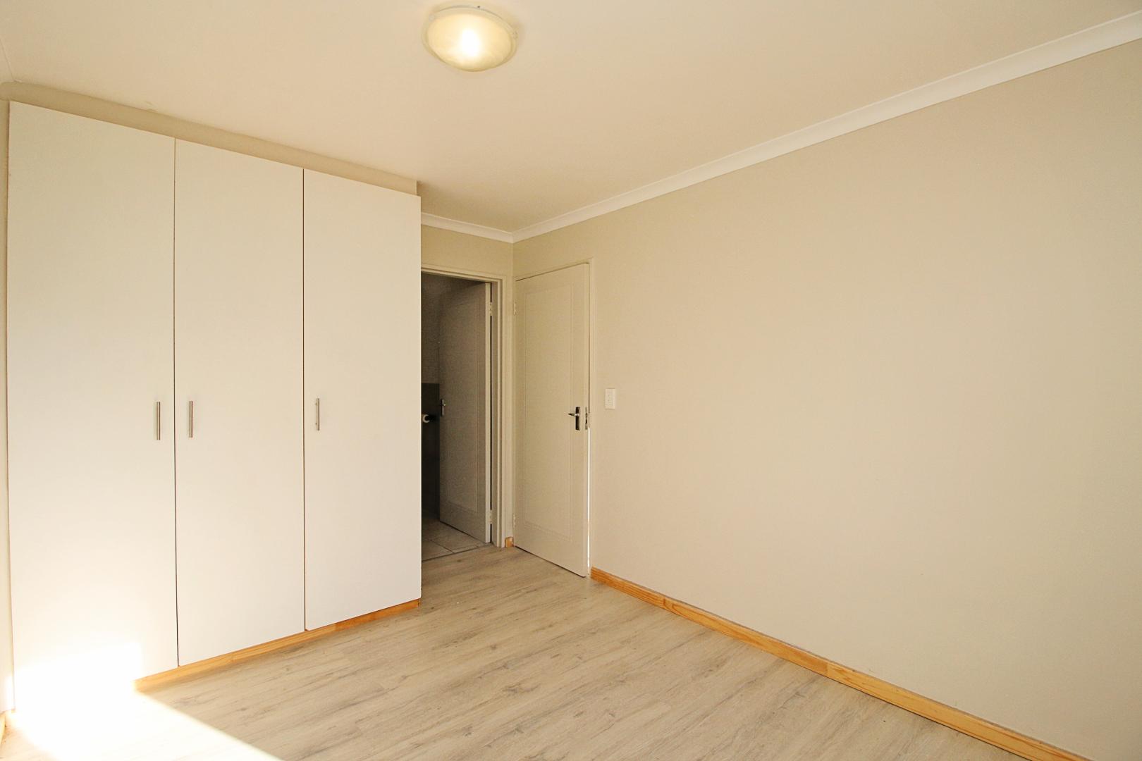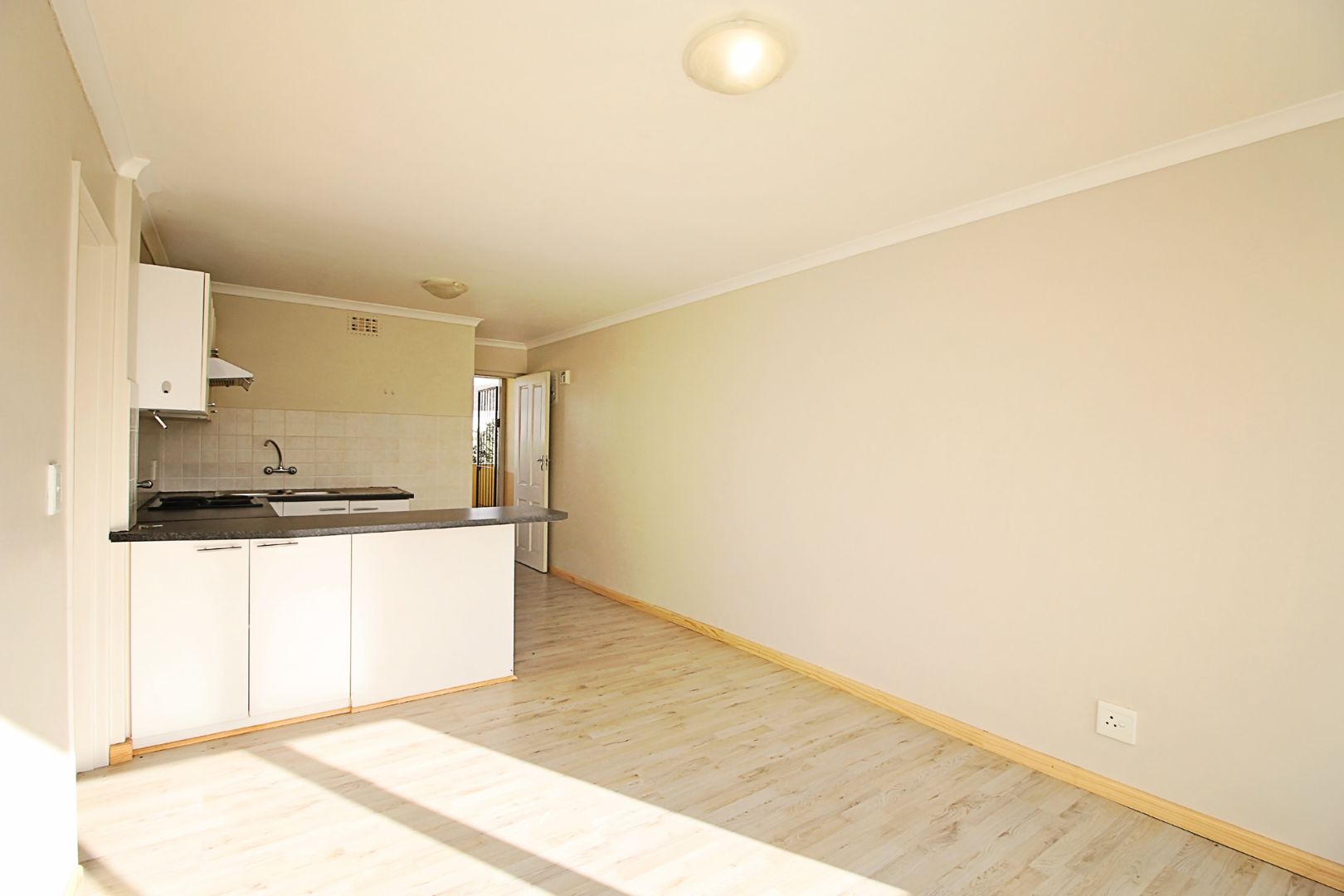 This first floor apartment is at Longbeach Village and consists of an open plan lounge and fitted kitchen. The lounge leads to a small balcony and the kitchen is fitted with an oven and hob and has plumbing for a front loader washing machine. The bedroom has built in cupboards with an en-suite bathroom consisting of a shower, basin and loo. There is a designated parking bay for one car. Electricity is pre-paid.