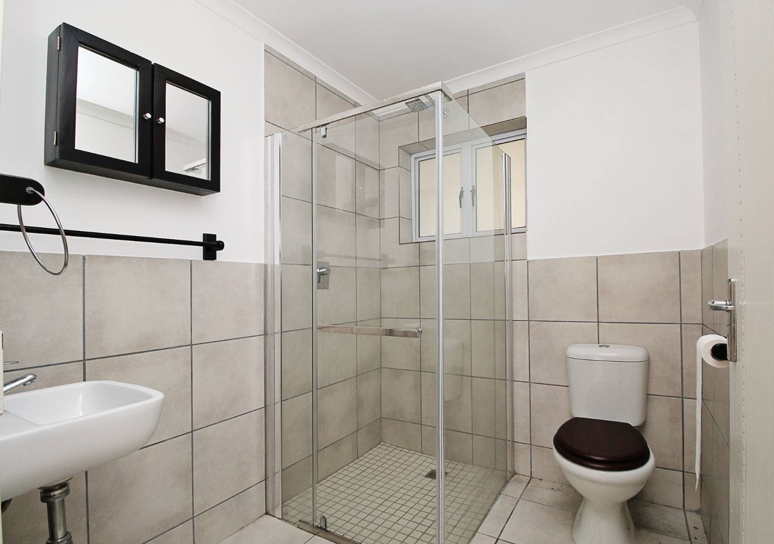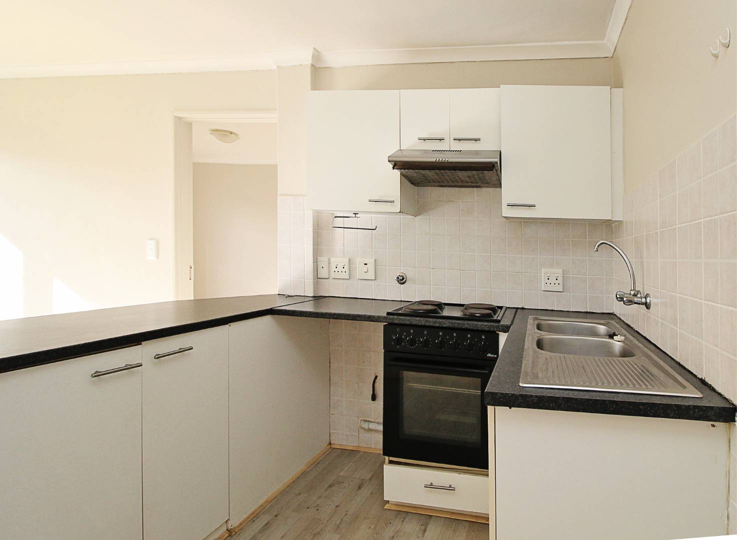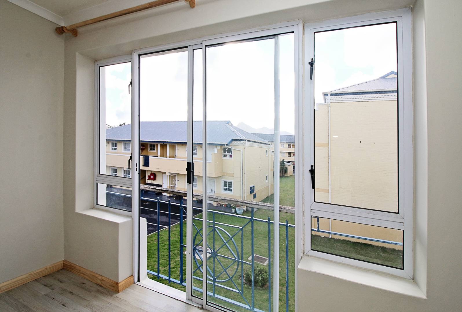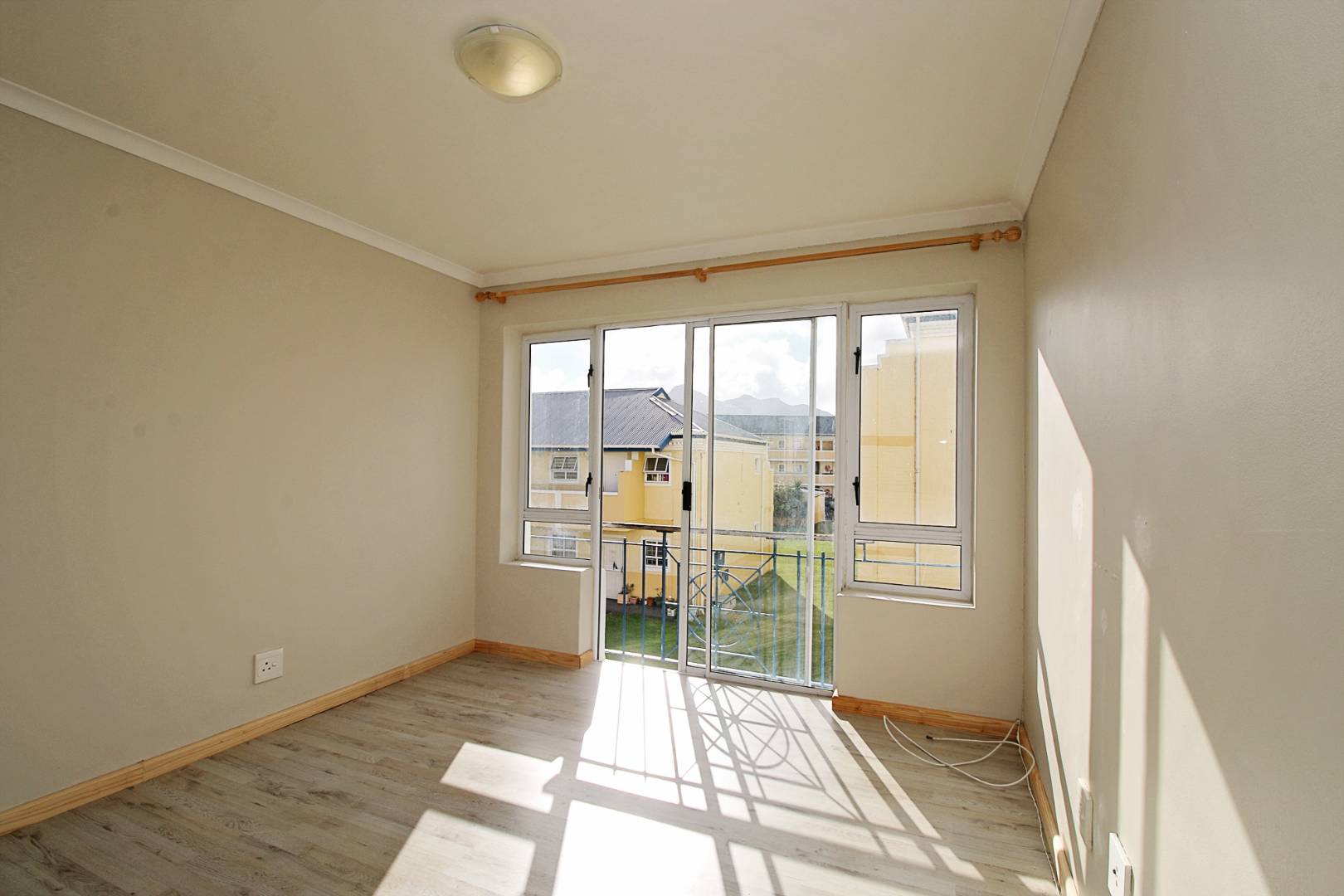 This first floor apartment is at Longbeach Village and consists of an open plan lounge and fitted kitchen. The lounge leads to a small balcony and the kitchen is fitted with an oven and hob and has plumbing for a front loader washing machine. The bedroom has built in cupboards with an en-suite bathroom consisting of a shower, basin and loo. There is a designated parking bay for one car. Electricity is pre-paid.