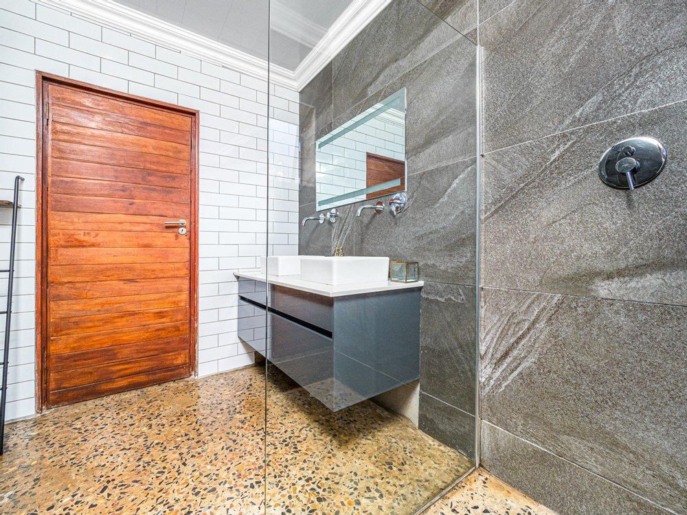 Lovely flow from the open plan kitchen, dining area with air-con, lounge with old fashioned wood burning fireplace, leading out to garden that is great for entertaining via aluminum stack doors.
