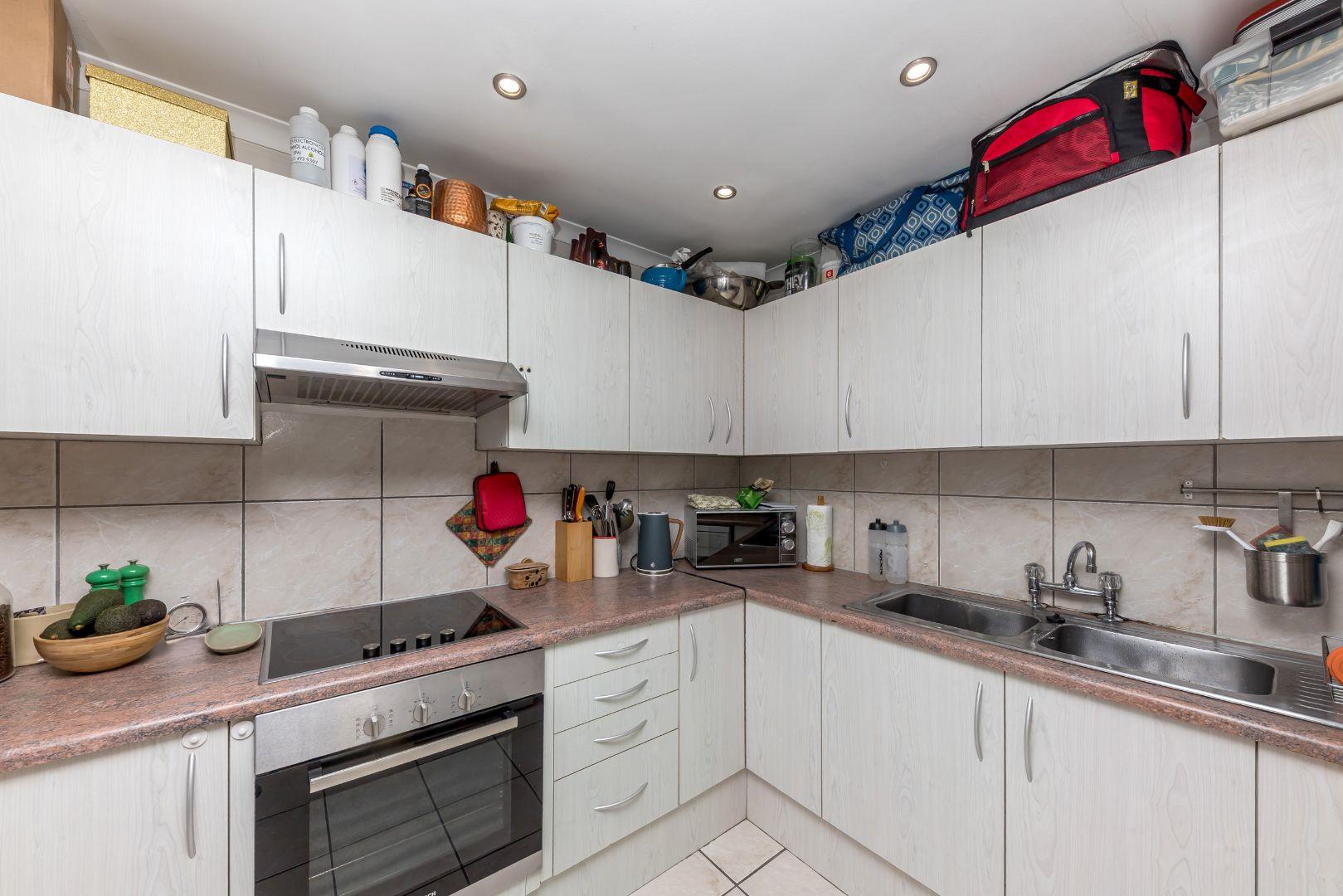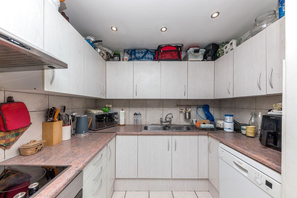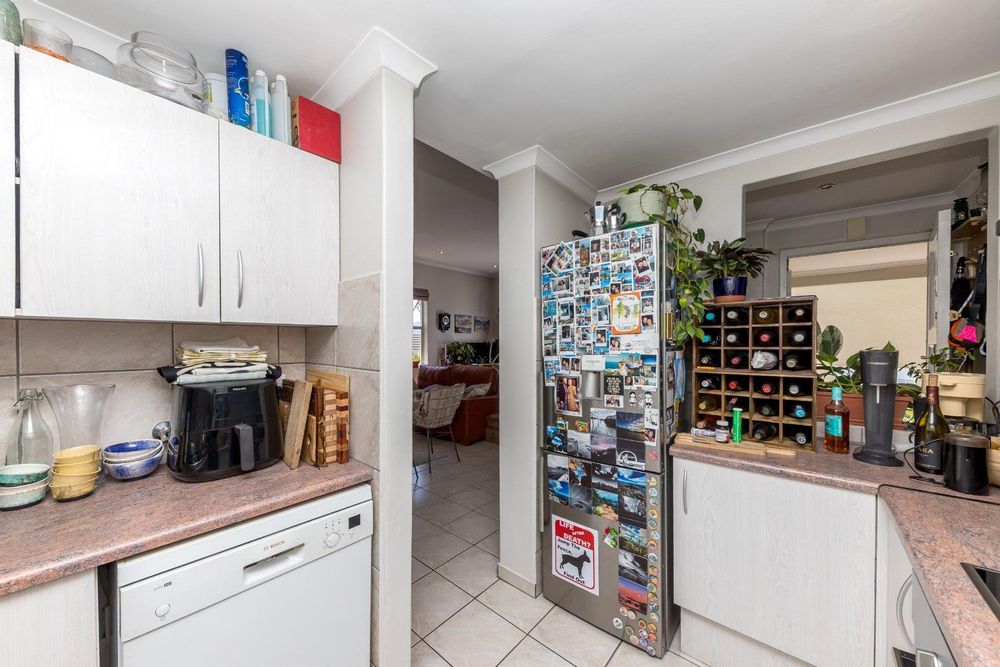 Enter into a welcoming open-plan living and dining space that is bathed in natural light. The kitchen, conveniently located to the left upon entry, boasts ample cupboard space, provisions for a dishwasher, and a functional, well-thought-out design that is perfect for daily use. A cleverly hidden laundry cupboard in the hallway efficiently houses both a washing machine and tumble dryer, ensuring the area remains tidy and organized.