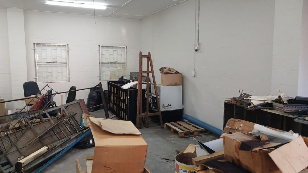 Current configuration is reception area, workshop area, small office and back storage area, with garage storage or workshop area.