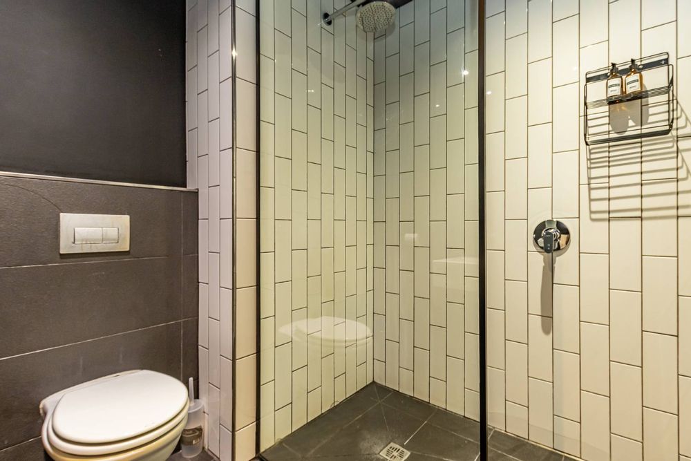 The bedroom is a tranquil retreat, enhanced by a stylish glass partition, which separates it from the living area while preserving the open-plan feel.