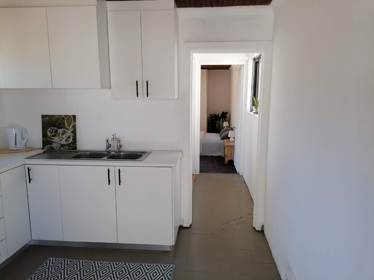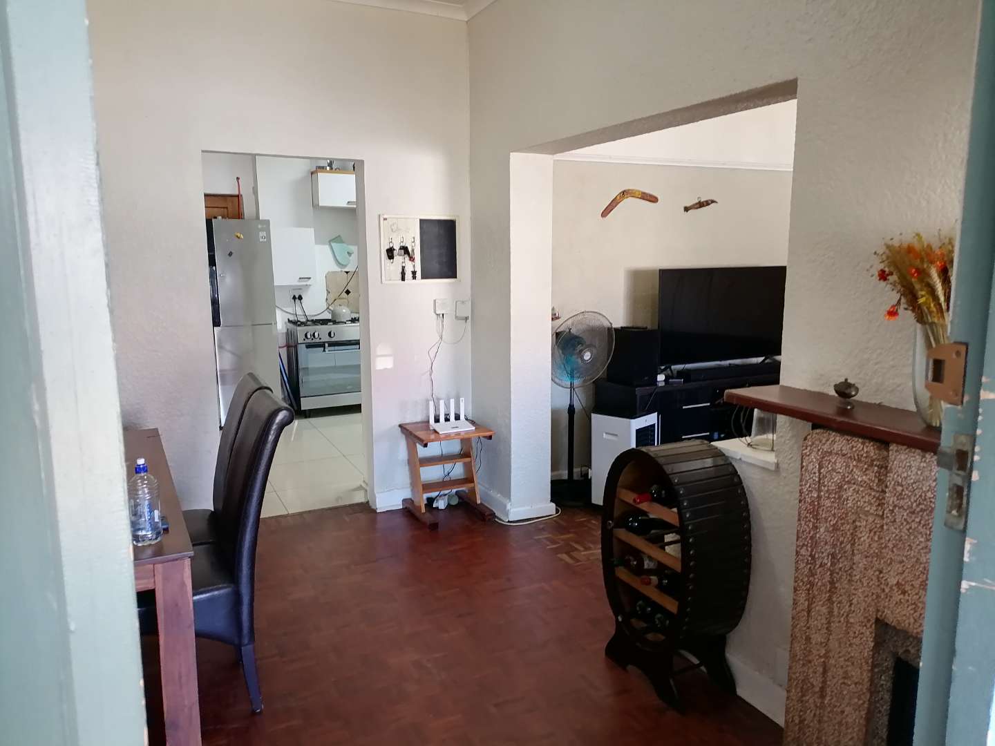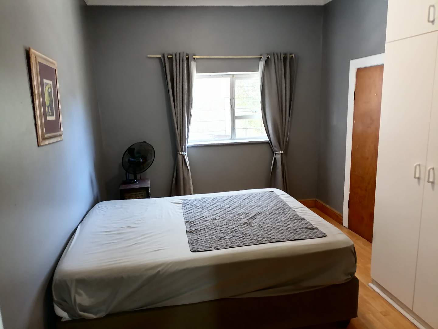 A light and sunny family bathroom is located off the kitchen and features a bath with an overhead shower, toilet, and large basin. The main bedroom offers ample built-in cupboards and excellent storage. The adjacent storeroom may be incorporated into the main bedroom to create additional space, serving perfectly as a dressing room, home office, or potential en-suite. The remaining two bedrooms are both spacious, light-filled, and fitted with built-in cupboards.